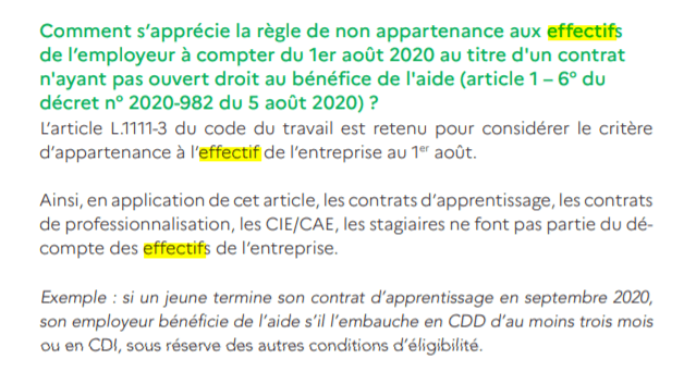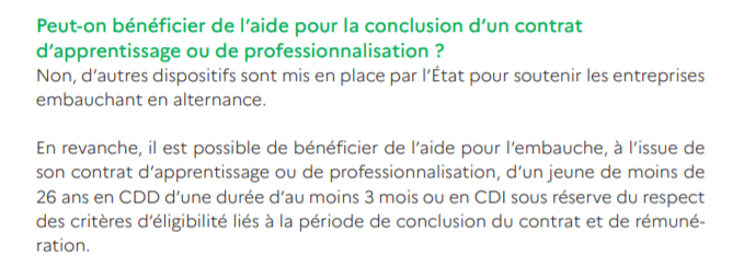 Elle confirme qu’un employeur peut bénéficier de l’aide en cas d’embauche, dans la période du dispositif, d’un jeune à l’issue d’un contrat d’apprentissage ou de professionnalisation :