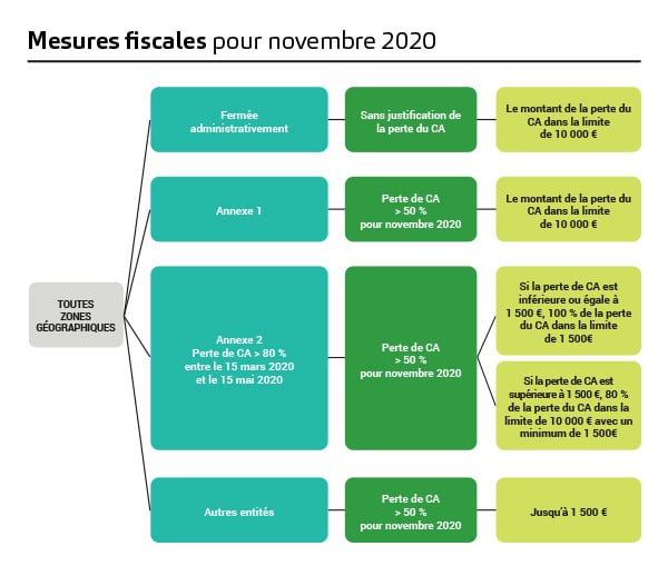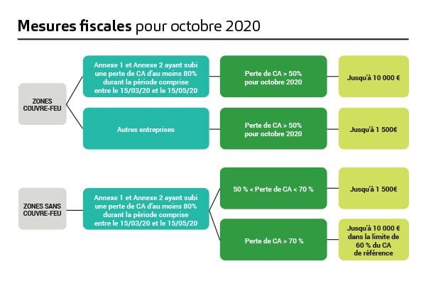 Ci-dessous un schéma récapitulatif pour octobre et novembre 2020 (Annexe 1 & 2 : Décret 2020-1328 du 02 novembre 2020)