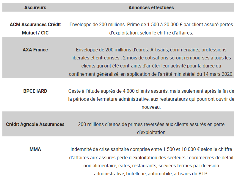 - D’autres compagnies, attachées généralement aux banques, telles que le CIC, le Crédit Mutuel, et désormais le Crédit Agricole, mettent en place des dispositifs spécifiques, auprès de certains clients, avec des dénominations diverses : prime de relance mutualiste, remboursement de quelques mois de cotisations, indemnité de crise sanitaire,…