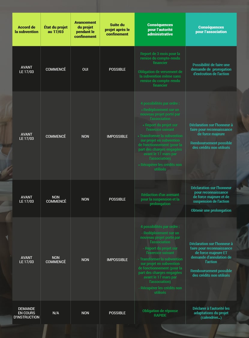 En fonction de la date d’accord de la subvention, de l’état du projet au 17 mars 2020 et au regard de l’avancement du projet pendant la période de confinement, les mesures de gestion des subventions seront adaptées.