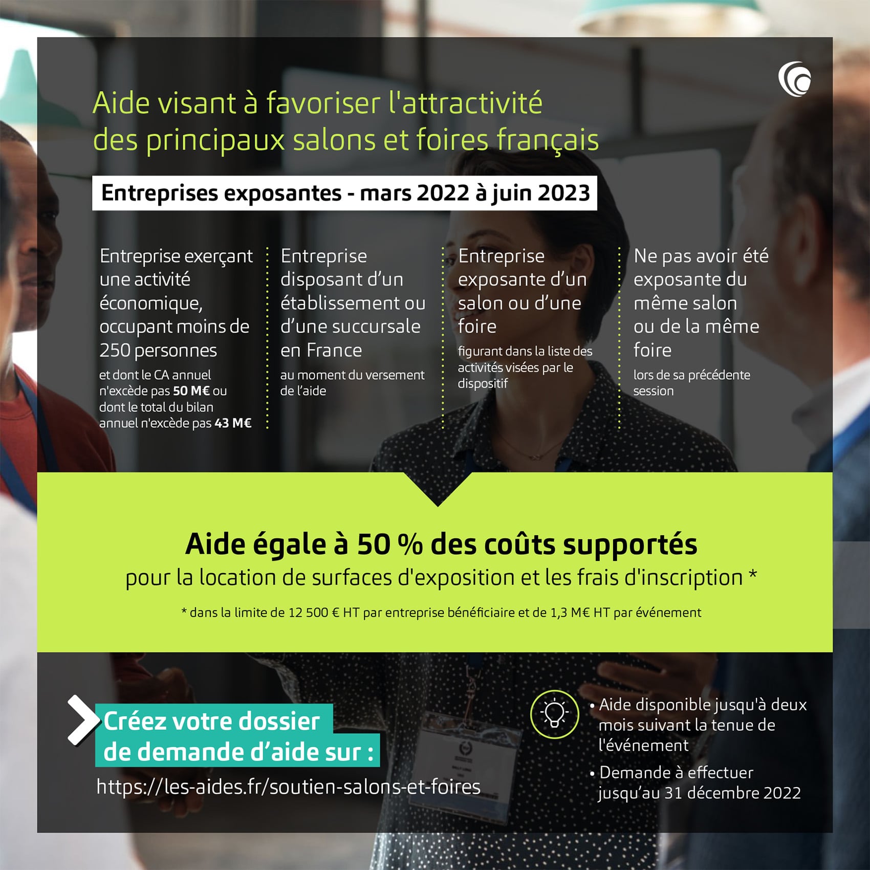 Une nouvelle aide vient d’être instituée par le Gouvernement afin de soutenir la reprise d’activité du secteur de l’événementiel, particulièrement touché par la crise sanitaire. 96 millions d’Euros seront consacrés à ce dispositif qui permettra d’appuyer la participation des entreprises aux foires et salons.