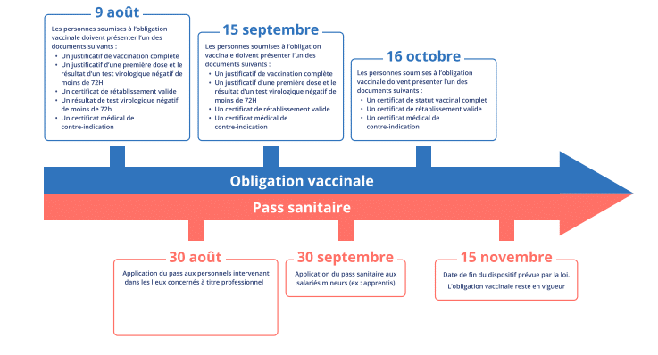 - Du 15 septembre au 15 octobre 2021 : d’au moins une dose de vaccin ou d’un certificat de rétablissement ou de contre-indication à la vaccination