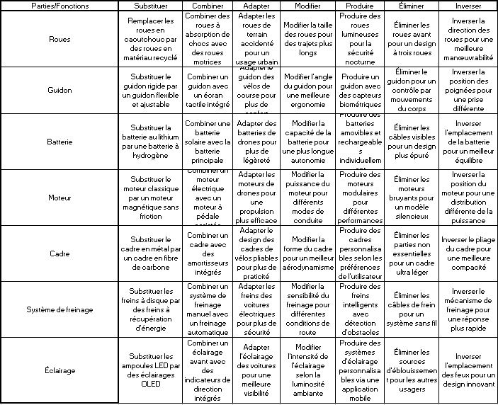 « Je travaille dans une société produisant des trottinettes électriques, et je cherche à trouver de nouvelles idées innovantes pour un nouveau modèle. Tu es un expert en innovation et créativité. À l’aide du concept SCAMPER (Substituer, Combiner, Adapter, Modifier, Produire, Éliminer, Inverser), prends toutes les fonctions et partie d’une trottinette et trouve une nouvelle idée à chaque fois. Je veux la réponse sous forme de tableau avec en colonne les fonctions et parties, et en ligne les 6 items du SCAMPER. »