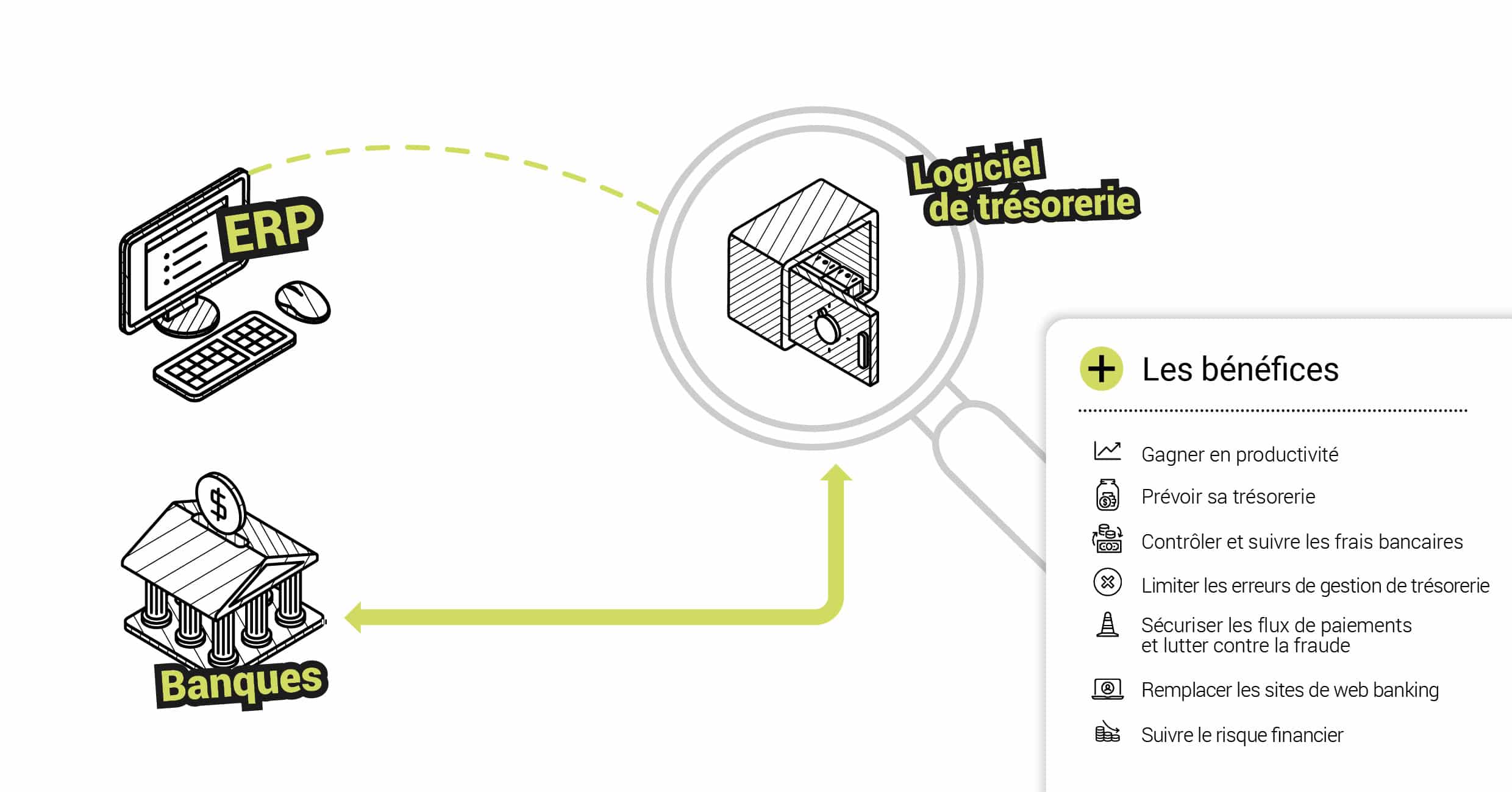Point d’échange dématérialisé unique avec toutes vos banques, le logiciel de gestion de trésorerie permet de :