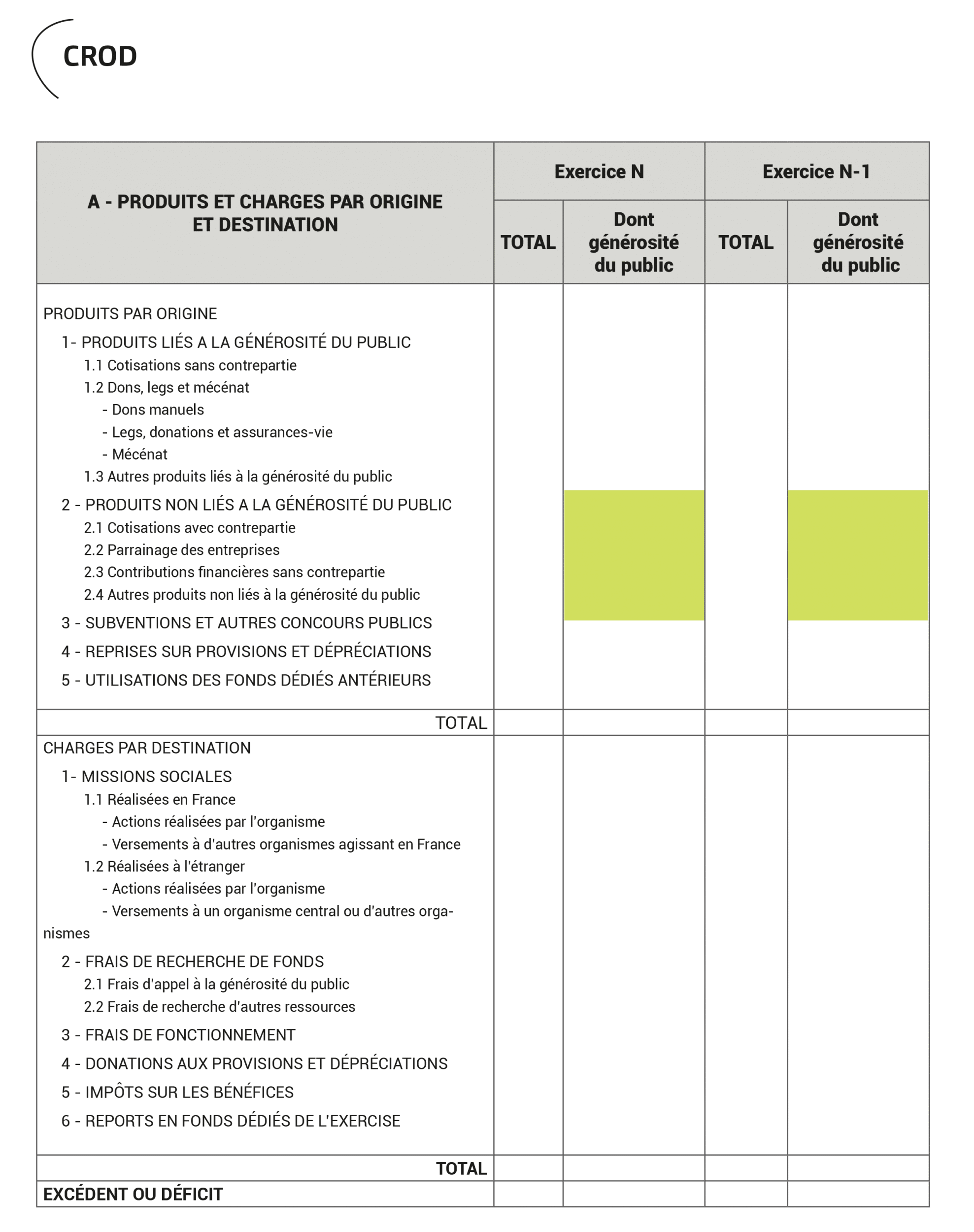 Le CROD, nouvellement créé par le règlement, a pour but de présenter l’ensemble des flux du compte de résultat par origine et destination et donc de présenter au mieux le modèle économique de l’entité et les actions réalisées. Une colonne permet aussi d’isoler les flux relatifs à la générosité du public.