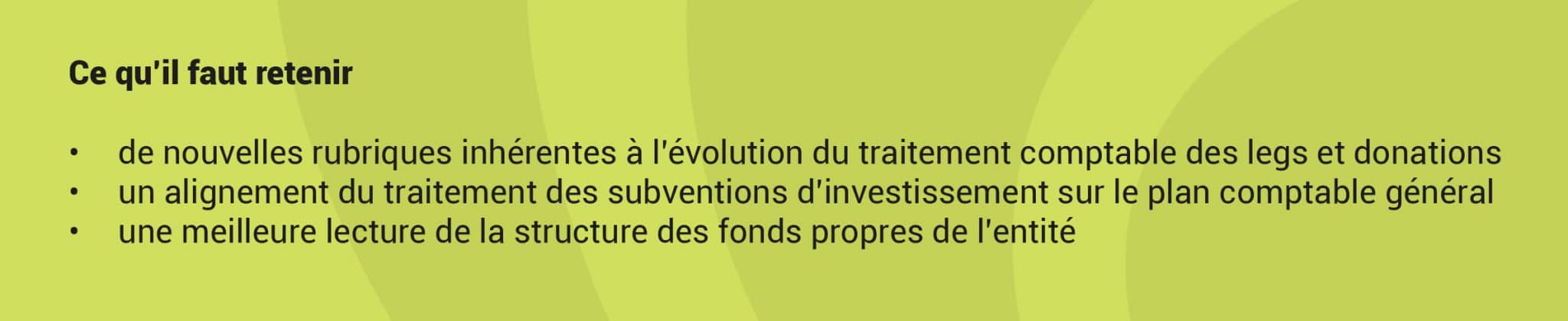 Ces dernières figurent en dessous de la situation nette. Elles sont reprises au résultat au rythme de l’amortissement du bien qu’elles financent. Le traitement comptable des subventions d’investissement est identique à celui décrit dans les règles communes du PCG car il n’y a pas d’élément spécifique dans le règlement ANC 2018-06.