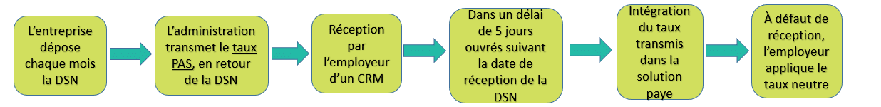 L’administration fiscale met le taux de Prélèvement à la source (PAS) à disposition de l’employeur mensuellement en retour de chaque DSN, dans un Compte Rendu Métier nominatif (CRM).