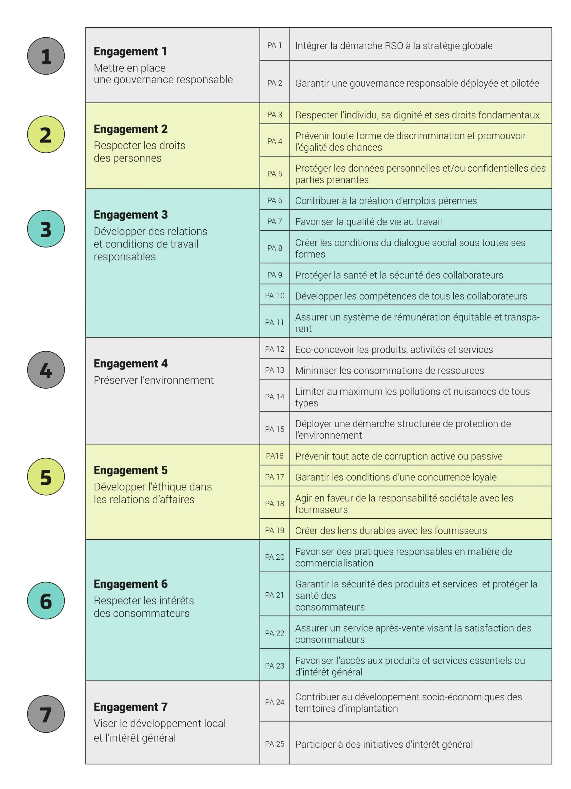 Aligné sur l’ISO 26000, ce référentiel est le plus utilisé en France. Il se décompose en plusieurs parties « engagements » :